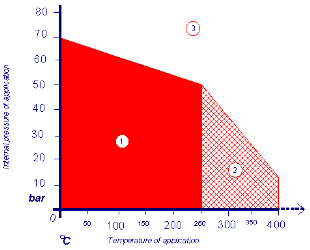 请注意以下图表所示仅作为指导,该参数引用时要根据垫片的厚度和具体操作条件。本参数参考厚度 2.0 mm,所有操作我温度和压力根据接触的化学介质而定。请查阅 KLINGER 公司的相关化学介质适用表或使用 KLINGERexpert 计算机设计软件。
